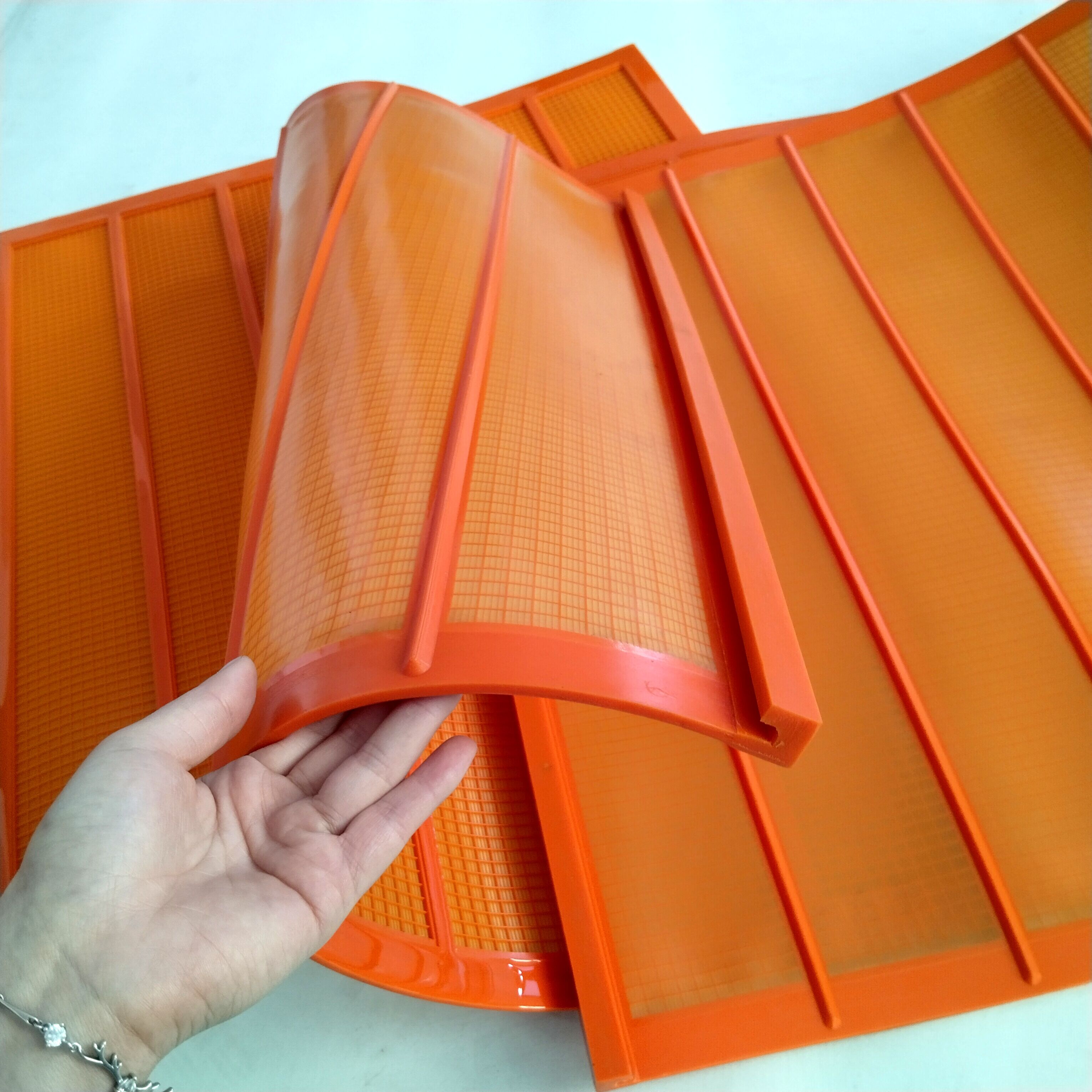 পলিউরেথেন হাই-ফ্রিকোয়েন্সি স্ক্রিন মেশ, যা নমনীয় পলিউরেথেন ফাইন স্ক্রিন মেশ নামেও পরিচিত, উচ্চ-স্থিতিস্থাপক পলিউরেথেন উপাদান দিয়ে তৈরি যাতে অভ্যন্তরীণ উচ্চ-শক্তির ফাইবার স্কেলেটন থাকে যা টান প্রতিরোধের শক্তি বাড়ায়। এর হুক-এজ ডিজাইন স্থাপন এবং অপসারণকে সহজ করে। এই স্ক্রিন মেশের চমৎকার পদার্থবিজ্ঞান এবং যান্ত্রিক বৈশিষ্ট্য রয়েছে: উচ্চ শক্তি, উচ্চ স্থিতিস্থাপকতা এবং উচ্চ ক্ষয় প্রতিরোধ। সাধারণ স্পেসিফিকেশনগুলির মধ্যে রয়েছে 1045*700; 1245*700, ইত্যাদি, যার মেশ খোলা 0.075 থেকে 3মিমি পর্যন্ত হয়, কাস্টমাইজড আকার ঐচ্ছিক।